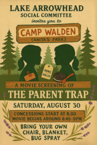 The Lake Arrowhead Social Committee invites you to CAMP WALDEN (aka Anita’s Park!) for a sunset screening of The Parent Trap (1998)! It was a close race, we will plan to do the Goonies next time!